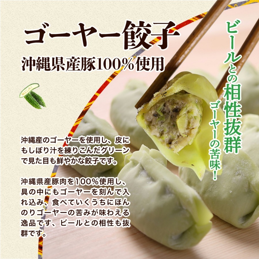 沖縄産のゴーヤーを使用し、皮にもしぼり汁を練りこんだグリーンで見た目も鮮やかな餃子です。 ビールとの相性も抜群です。