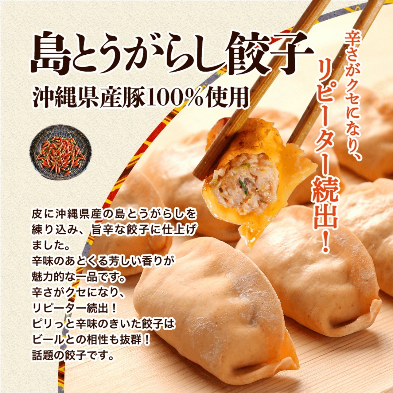 皮に沖縄県産の島とうがらしを練り込み、旨辛な餃子に。 辛味のあとくる芳しい香りが魅力的な一品。