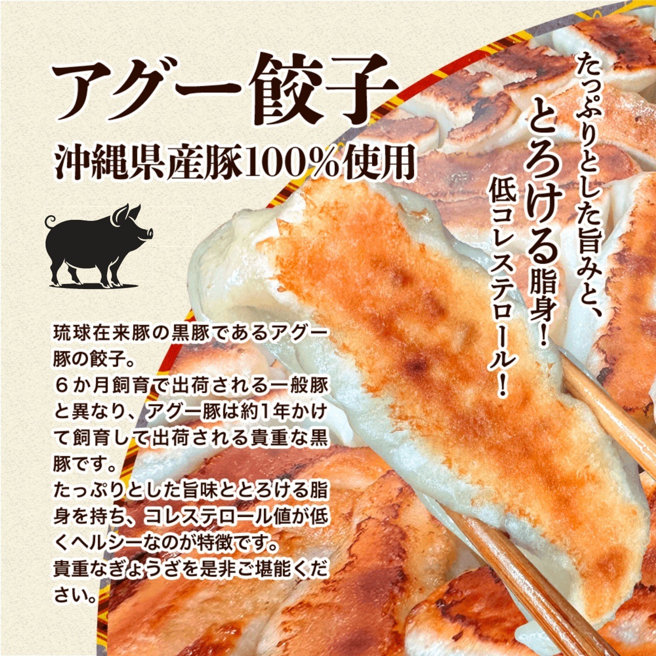 琉球在来豚のアグー豚の餃子! 貴重な黒豚のアグー豚は、たっぷりとした旨味ととろける脂身を持ち、コレステロール値が低くヘルシーさが特徴です。