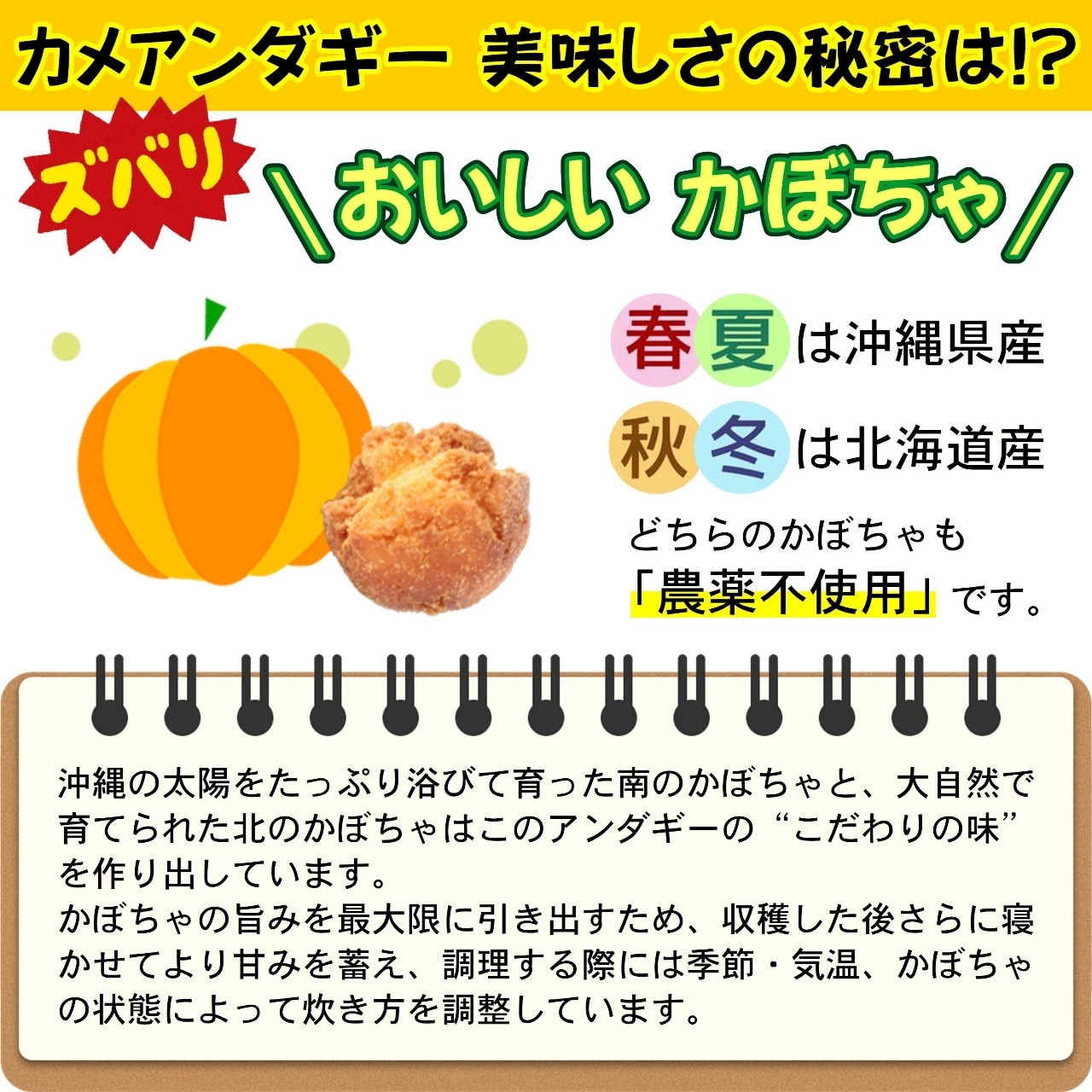 かぼちゃも色んな種類がある中で、どれが自分たちのアンダギーに合うのか試行錯誤した結果、春夏は沖縄県産、秋冬は北海道産を使用しています。