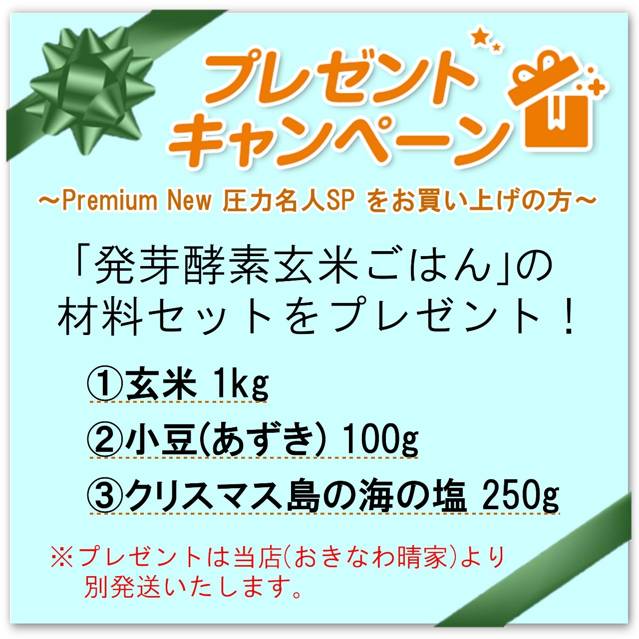 「Premium New 圧力名人SP」をお買い上げいただくと「発芽酵素玄米ごはん」の材料セットをプレゼントいたします。
