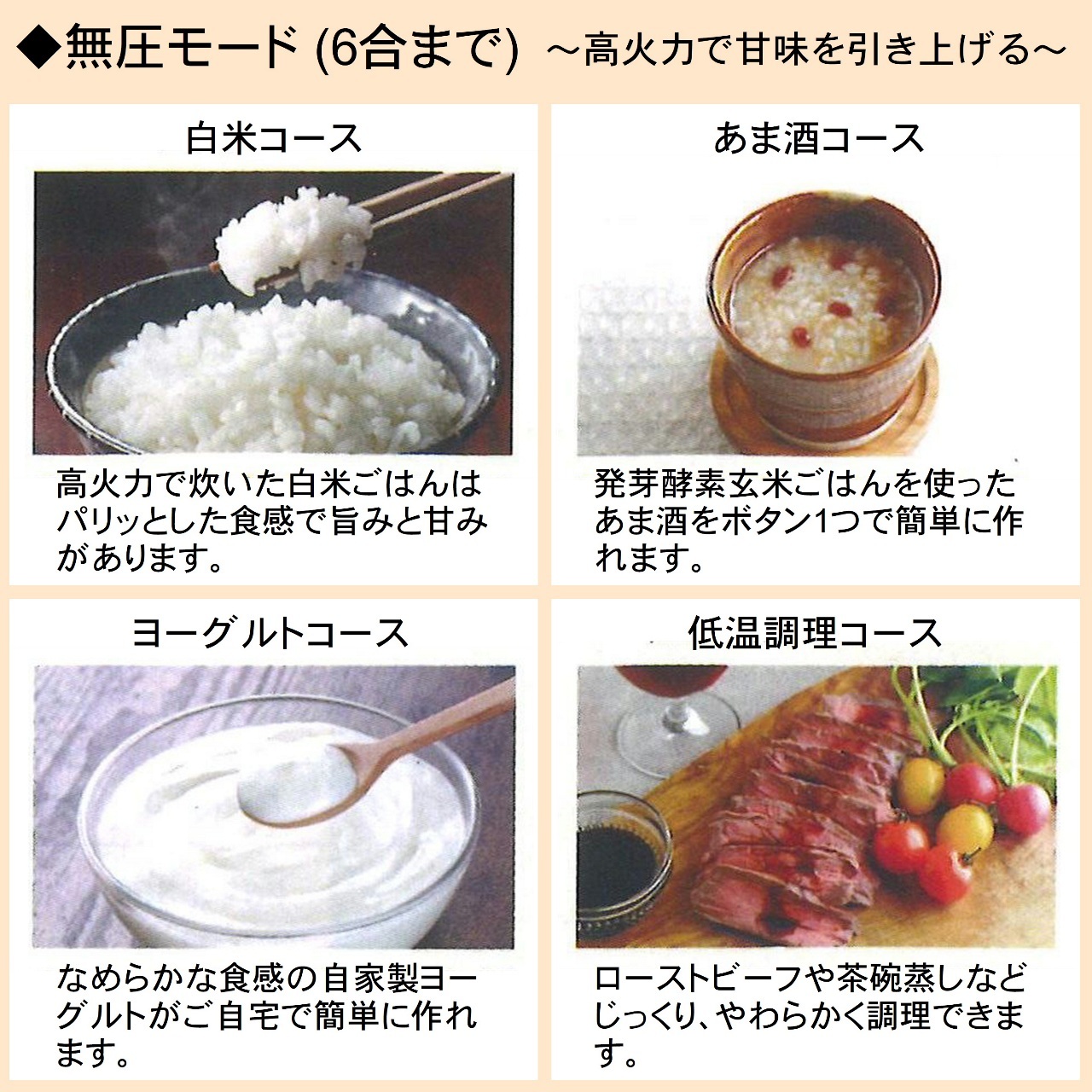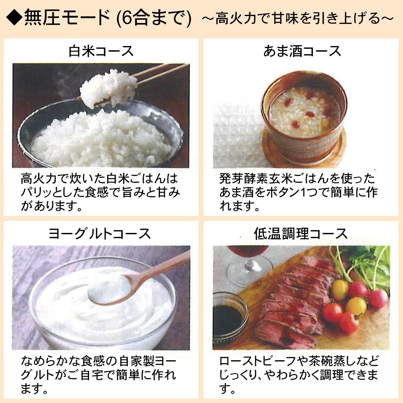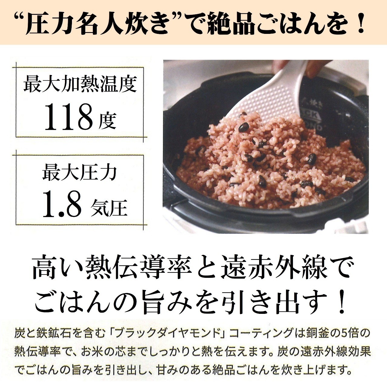 高圧力でふっくらもちもちに仕上げる圧力モードと、高火力で甘味を引き上げる無圧モードで使い分け可能に。