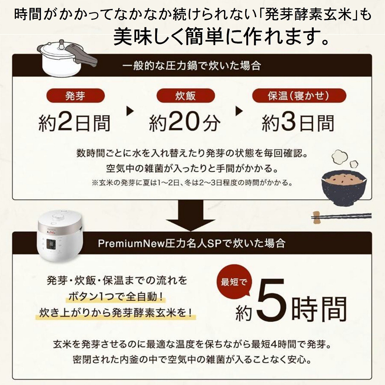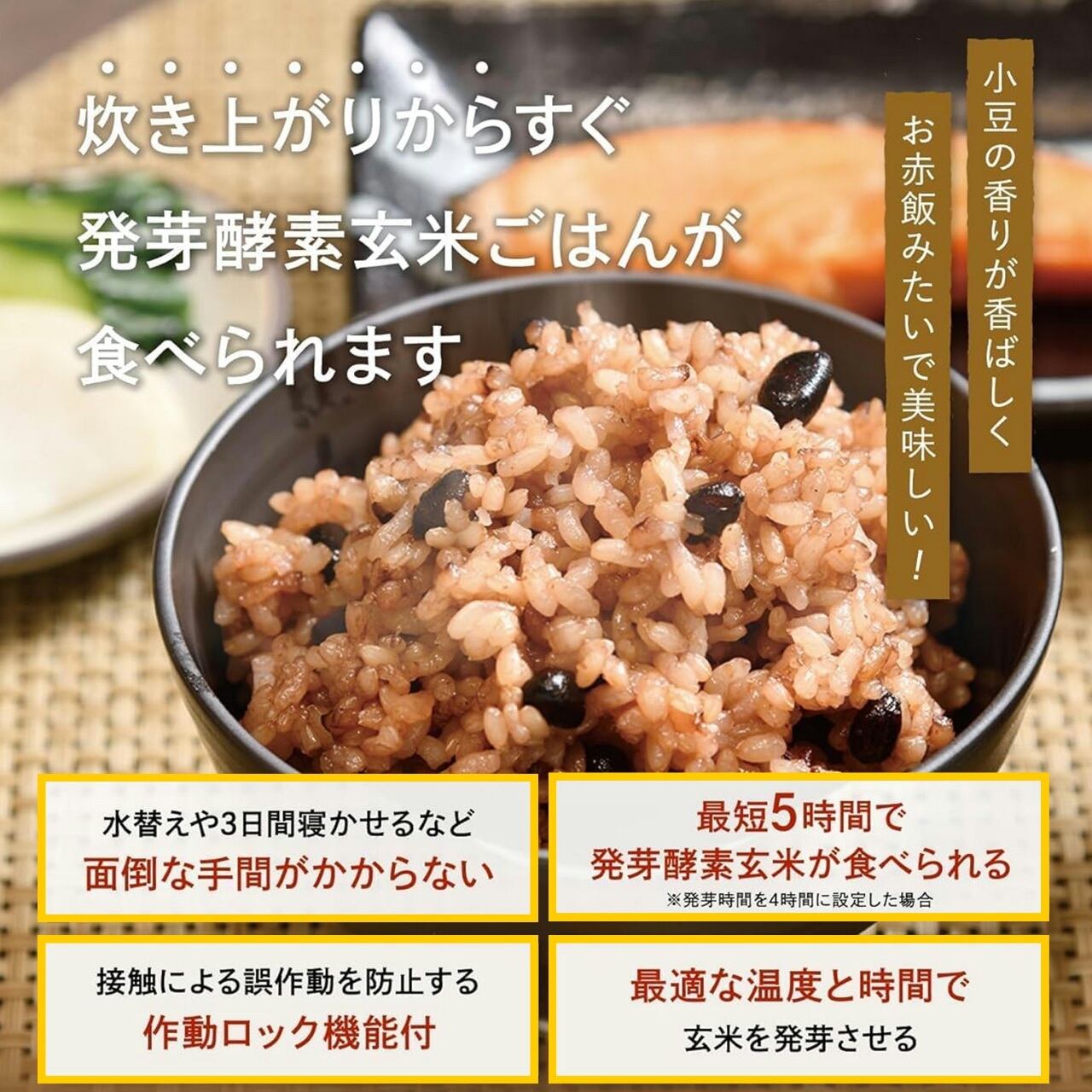 ボタン1つで「発芽」「炊飯」「保温」が全自動!忙しい毎日でもご自宅で簡単に発芽酵素玄米ごはんが食べられます。
