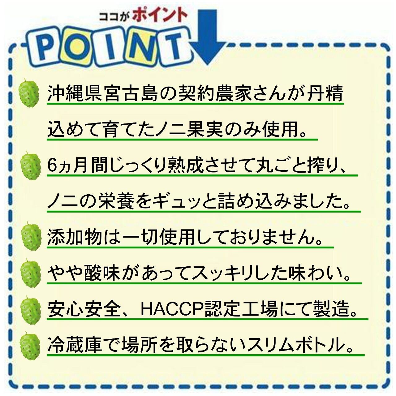 ※沖縄県産ノニは、常に味が一定ではありません。収穫時季や天候などによって味が変化します。