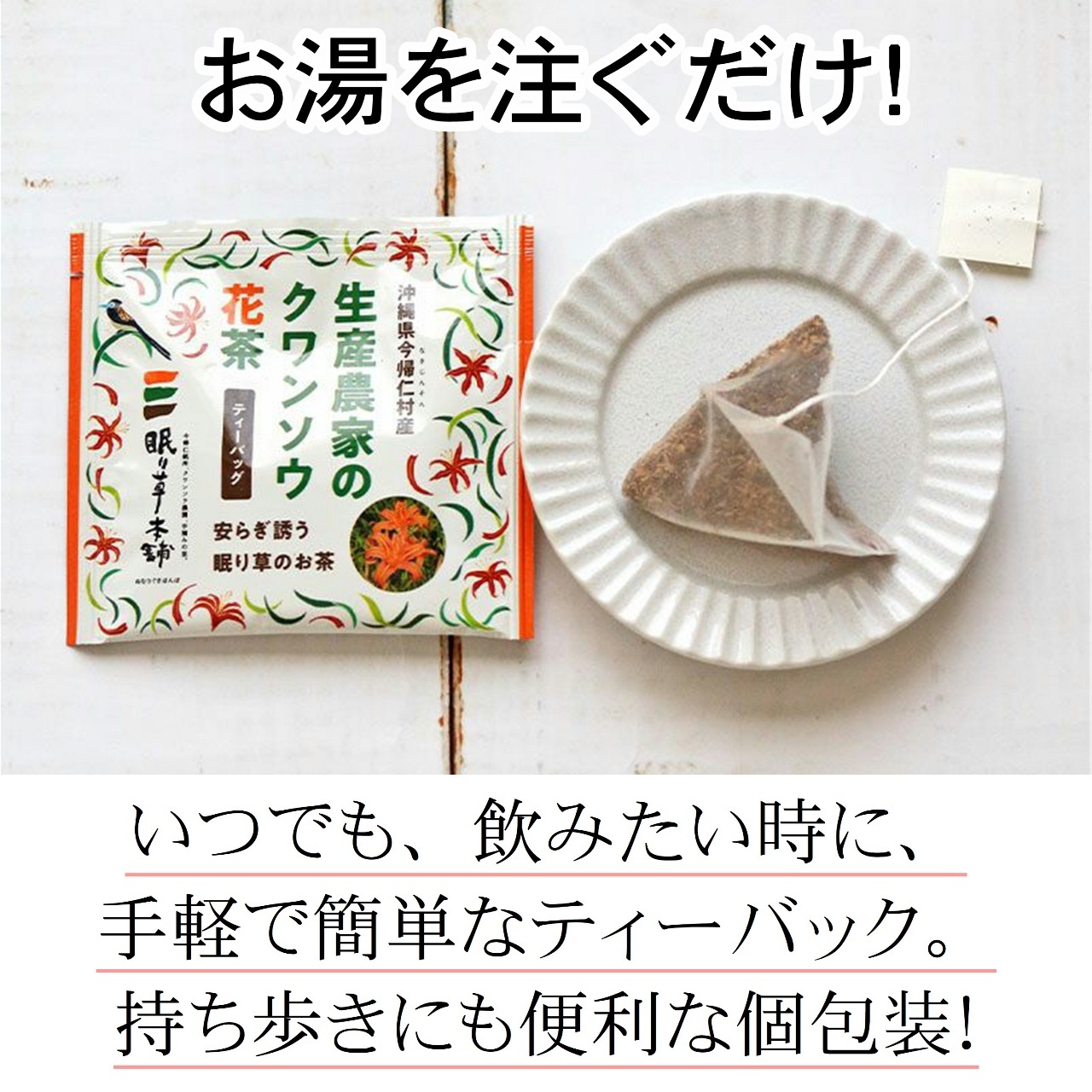 本製品は沖縄県今帰仁村の農園で手摘みしたクワンソウの葉と茎を75%、花を25%使用し、クワンソウの味わいを残しつつ飲みやすくしたハーブティーです。
