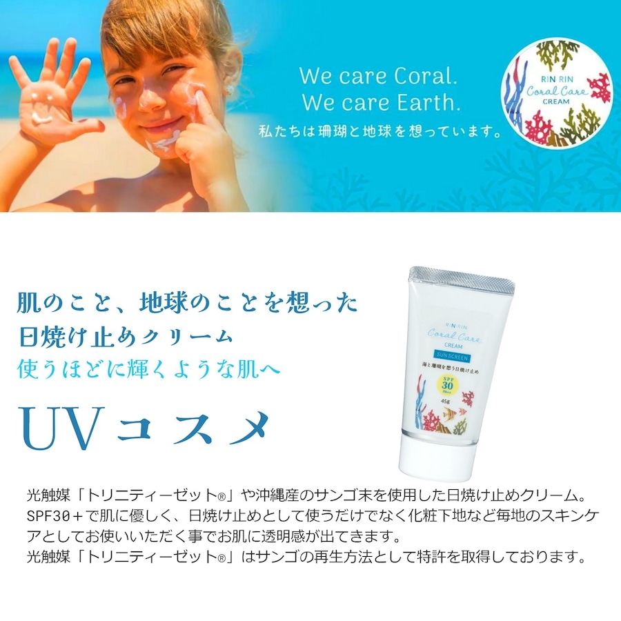 そして、サンゴの再生方法で特許を取得した光触媒「トリニティ-ゼット」が海の中でサンゴの再生をサポートします。肌と地球に優しいUVクリームとなってます。