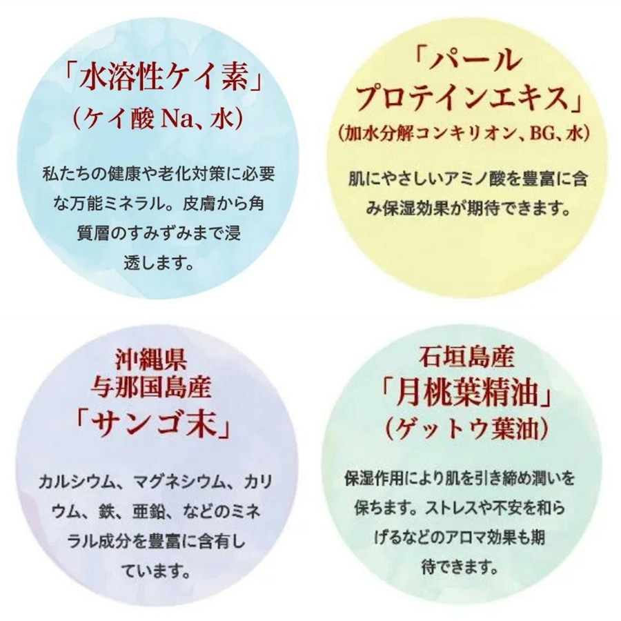 ■全成分:水、酸化チタン、セタノール、ヤシ油脂肪酸、PEG-7グリセリル、ミネラルオイル、トリ(カプリル酸/カプリン酸)グリセリル、グリセリン、ミツロウ、サンゴ末、ポリソルベート60、ペンチレングリコール、ステアリン酸PEG-23、ポリヒドロキシステアリン酸、ステアリン酸、アルミナ、ステアリン酸ソルビタン、ヒドロキシアパタイト、シルク、シクロデキストリン、ケイ酸Na、加水分解コンキオリン、BG、ゲットウ葉油